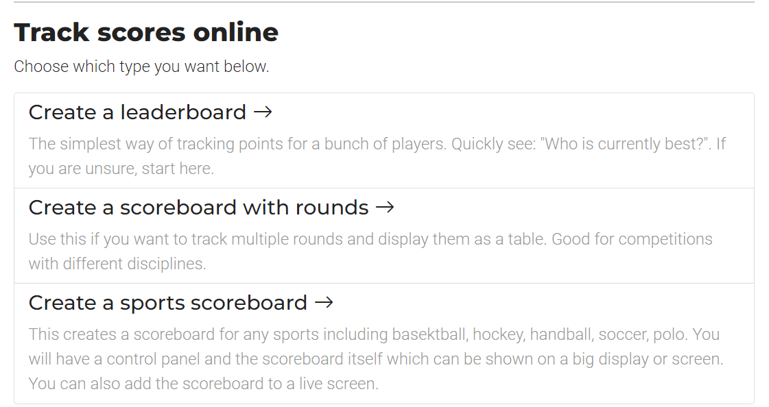 Create your own scoreboards and leaderboards and share them. Fun, easy and ideal for school, in the office, games and sport!