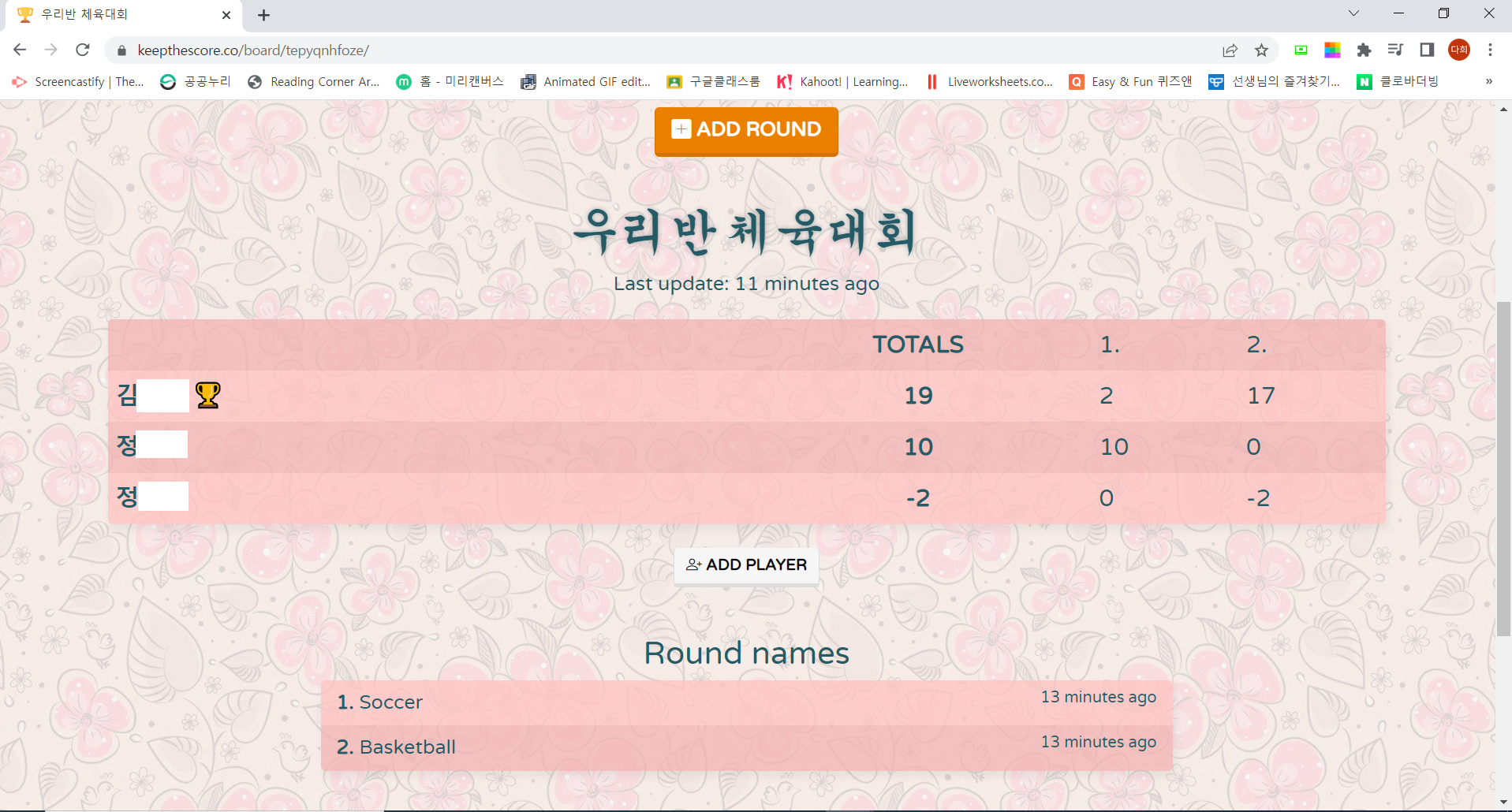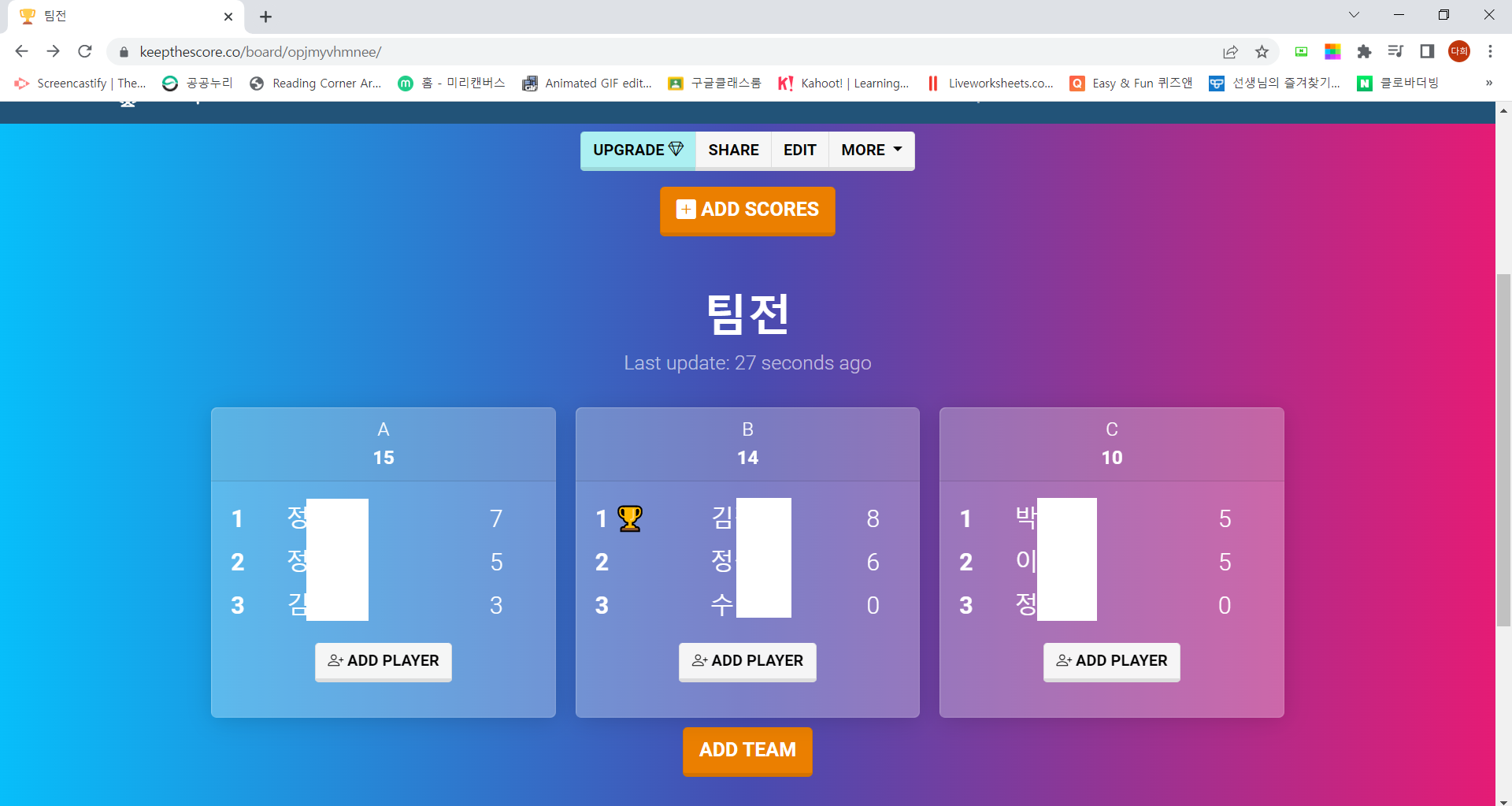 다만 팀은 2개만 생성할 수 있고, 지금 보는 화면은 Control panel이라 실제 Scoreboard를 보여줄 장치가 추가로 더 필요하다고 한다. 뭔가.. 영어 수업 시간에는 거의 활용할 일이 없지 싶다.