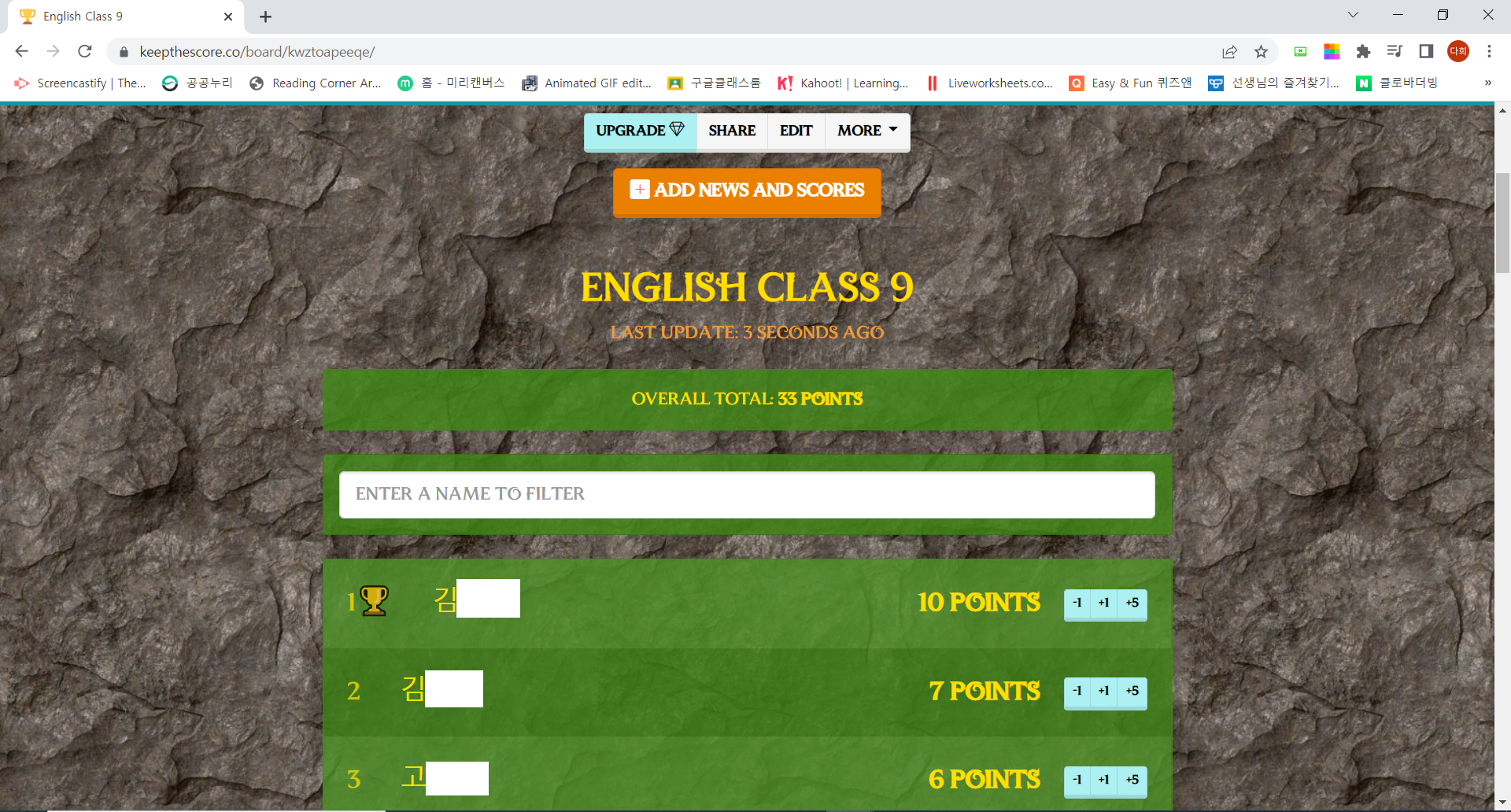 아래 캡처 화면에서 볼 수 있듯이, 전체 학생들의 리스트가 쭉 뜨고, 점수를 실시간으로 줄 수 있다.