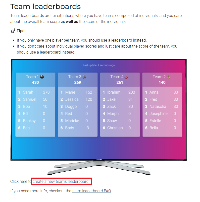 링크에 들어가면 점수판의 종류가 설명되어 있는데, 아래 사진에서처럼 'Create a new teams leaderboard'라는 하이퍼링크를 타고 들어가면 된다.